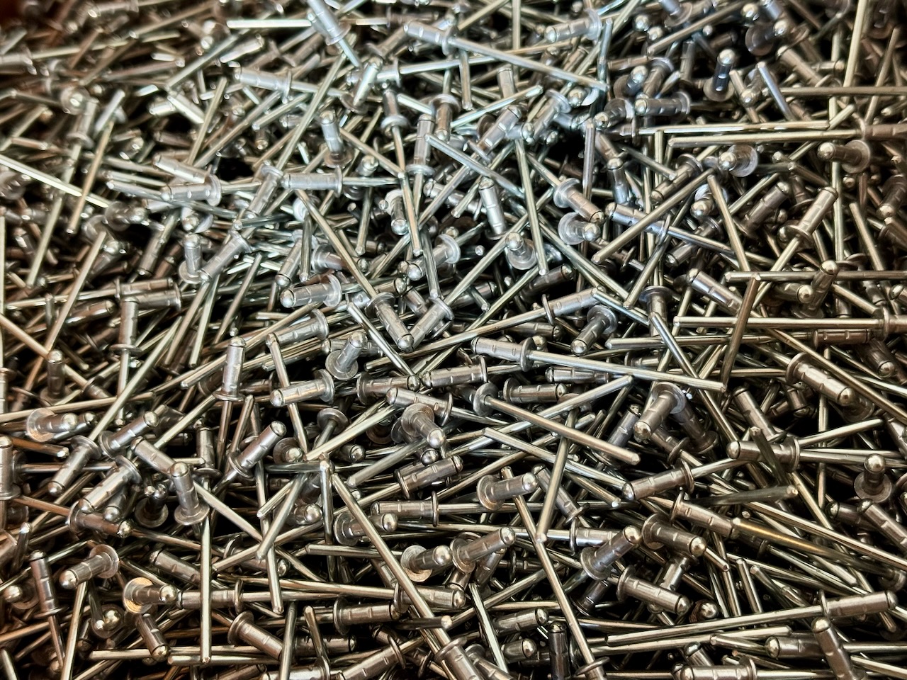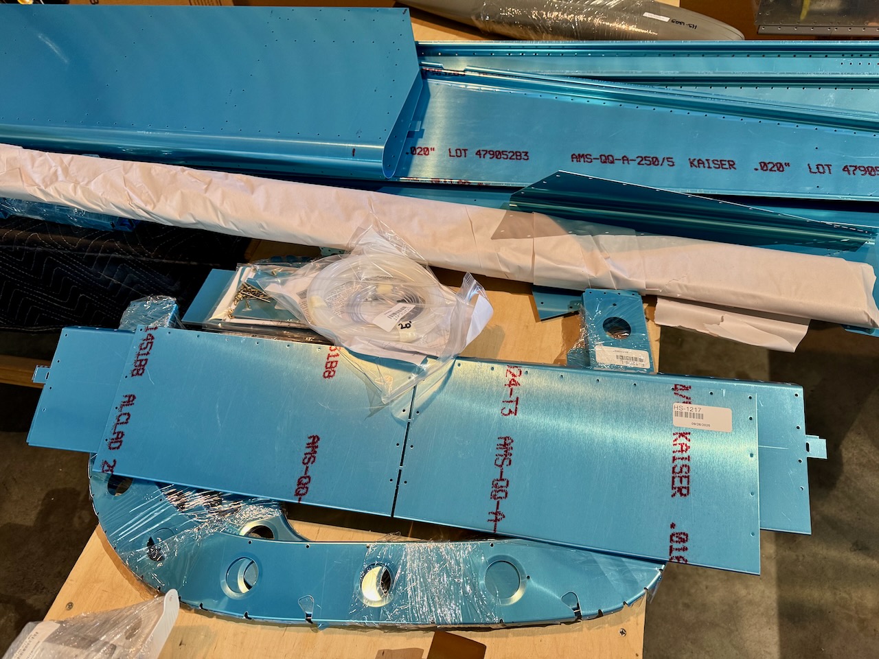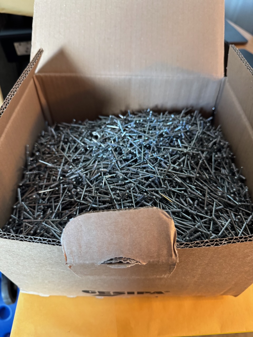Today was delivery day! The driver unloaded the oversized crate on the liftgate with ease. I was surprised, and pleased, to learn that the crate is now a huge box instead of a one-time custom built plywood crate. This way it’s easier to reuse/dispose/recycle and much lighter too. There were pretty thick corragated cardbord inserts on the sides. Included in this kit was the “faster kit” which is essentially a box full of 10,000 pull rivets! In addition to the 2,500 rivets that came with the empennage kit. Now, let the inventorying begin!