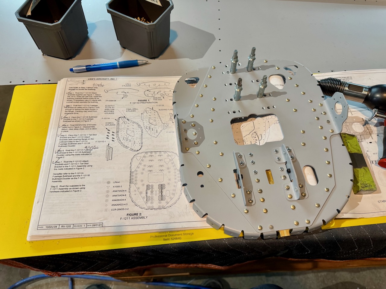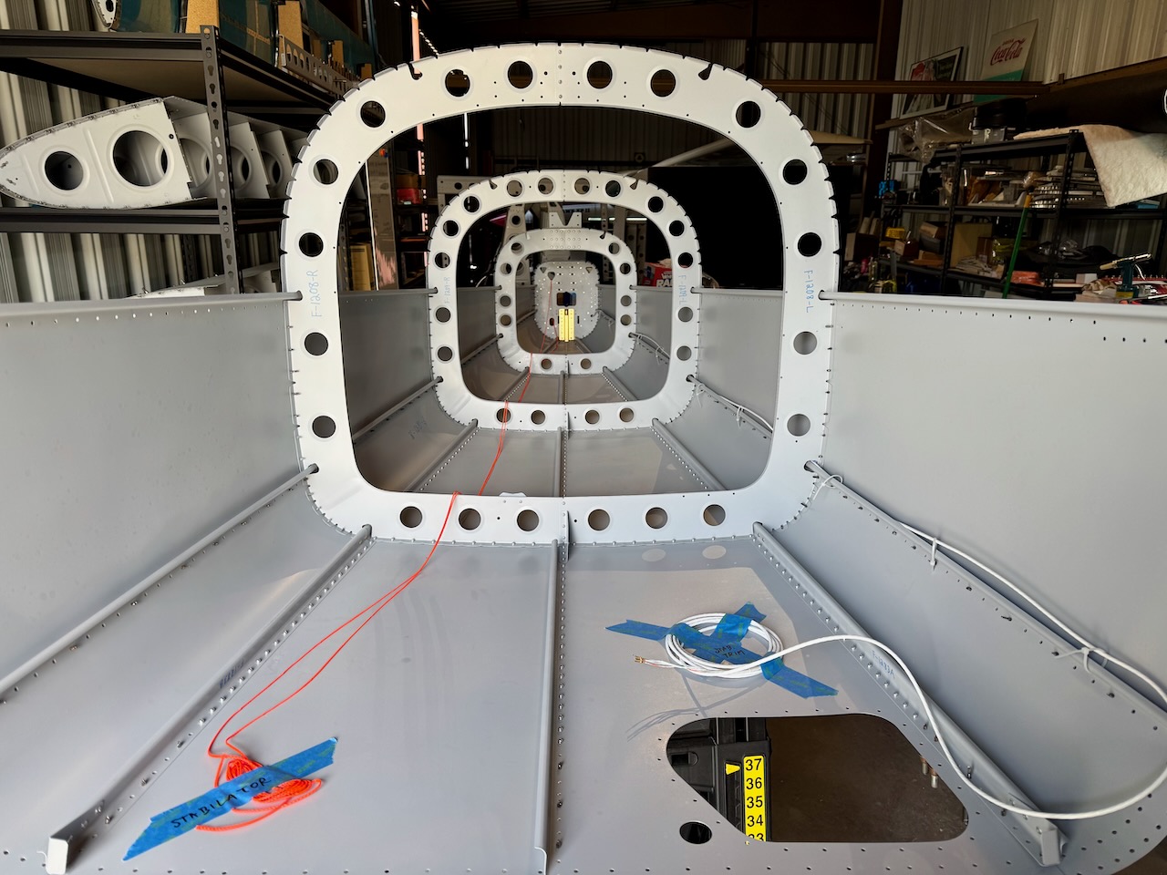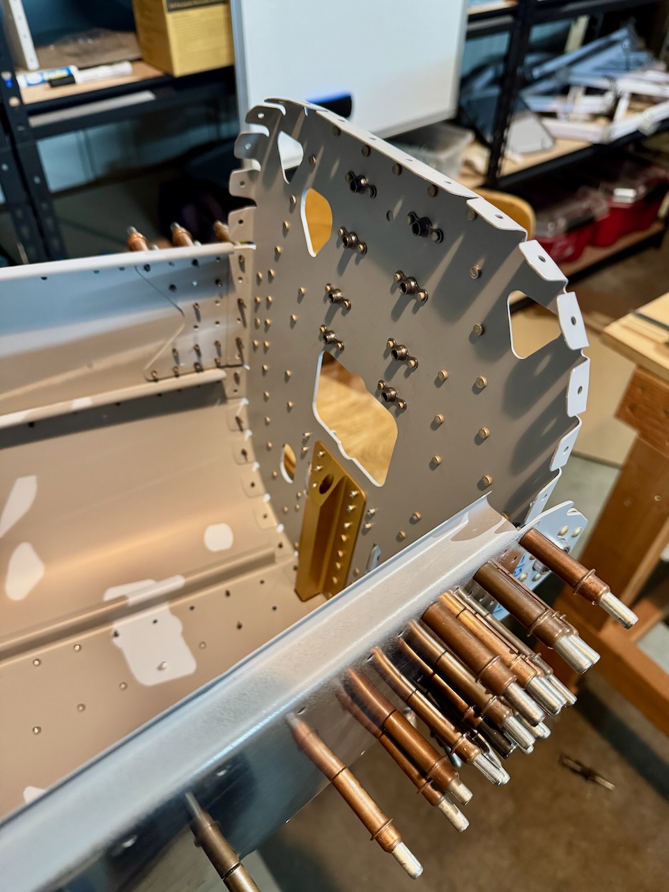 A lot of work getting the rear bulkhead finished. A large variety of rivets on that piece. Finished off with clecoing in it’s spot at the back of the tailcone.