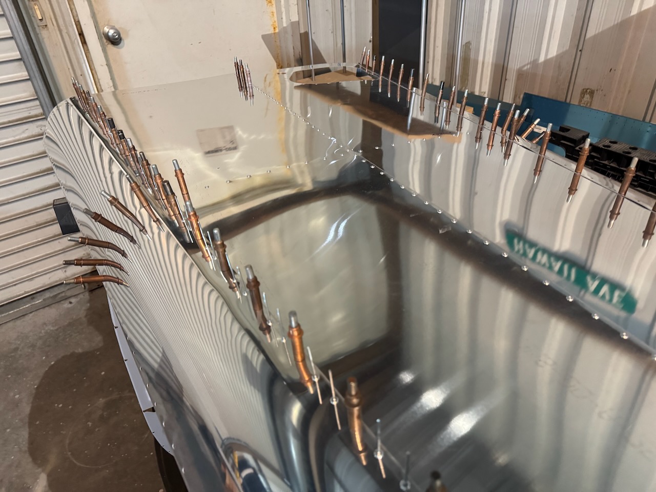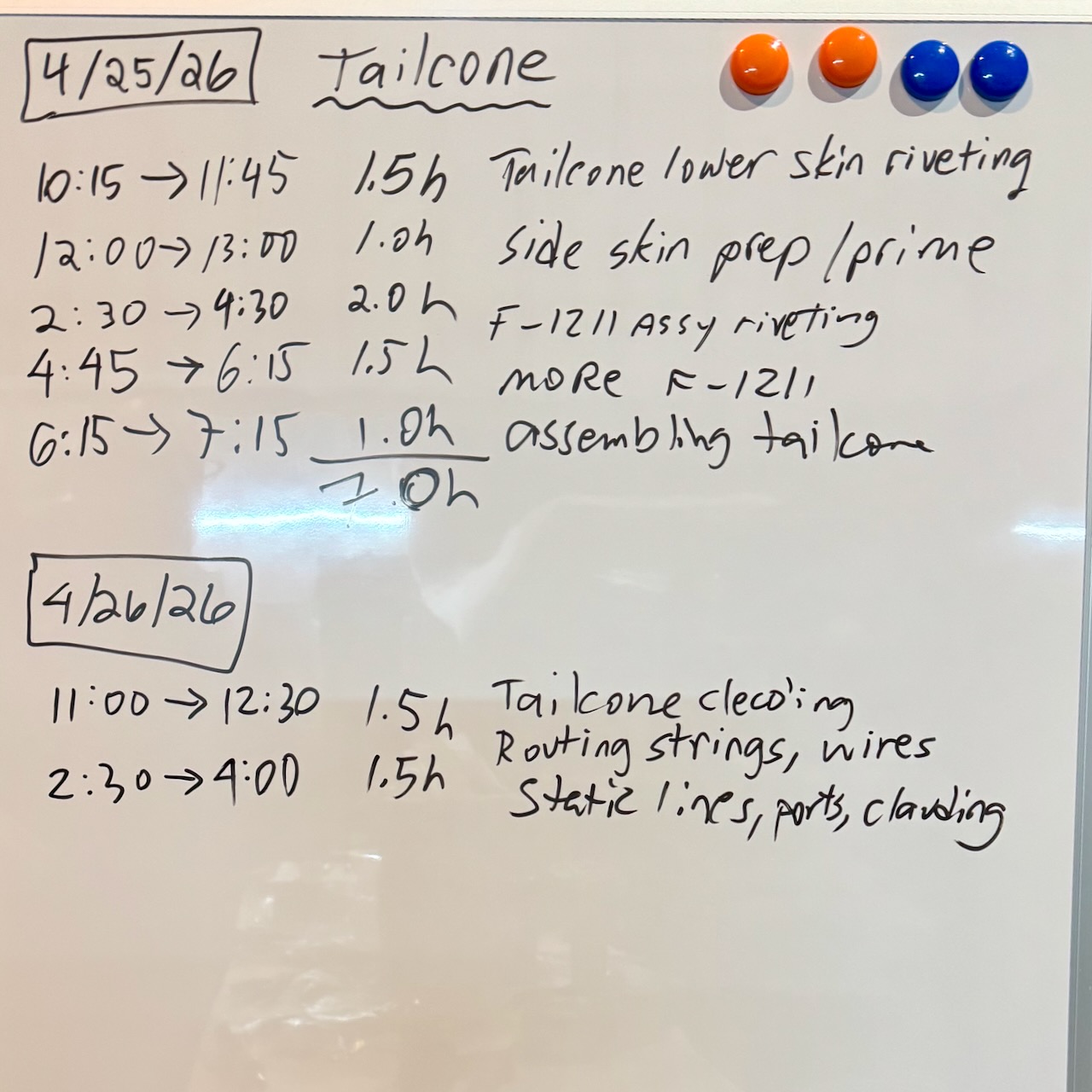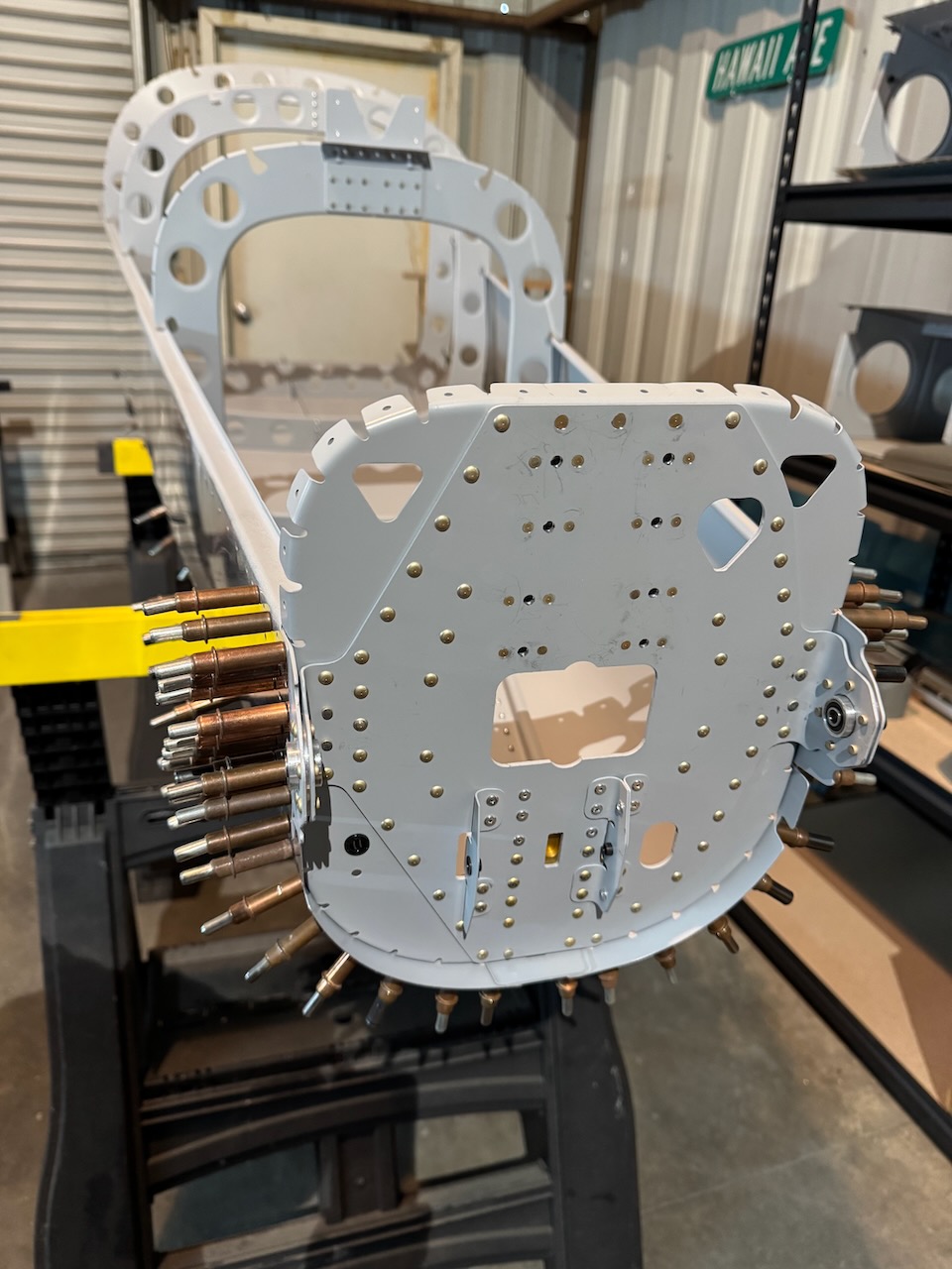 A lot of work getting the rear bulkhead finished. A large variety of rivets on that piece. Finished off with clecoing in it’s spot at the back of the tailcone.