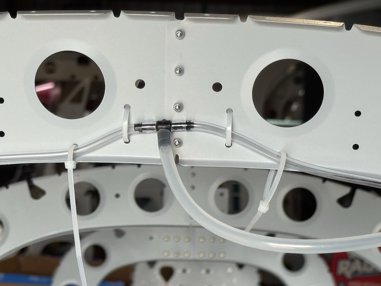 Then it was time to run some lines for the stabilator controls, a cable for the trim servo, and installing a pair of static air ports and air hoses. I secured the “tee” junction with zip ties to make sure it doesn’t rub against the rivets. I’ll also add some protection so the large hose doesn’t chafe on the fuselage frame flange. It’s not touching (it’s aimed away) but I’d like something soft there anyway.